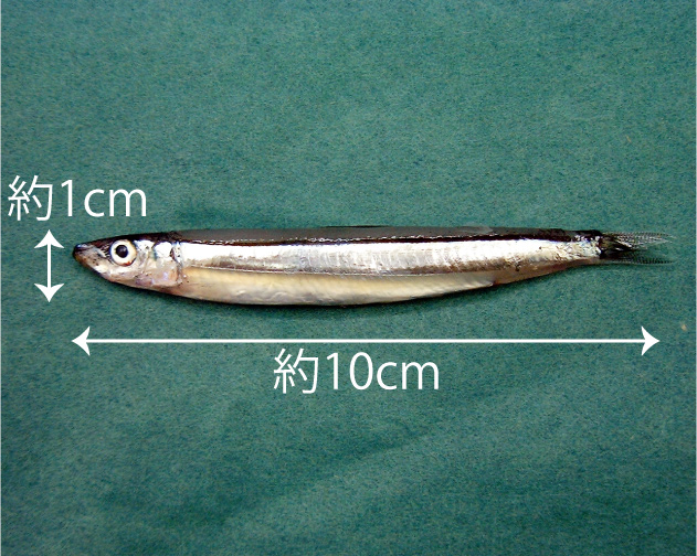 ウルメイワシ科で全長は約10cm程度の小さなお魚で、体は円形円筒形ですがやや平べったく体側に銀白色帯が走っている長崎県五島列島特産のお魚です。